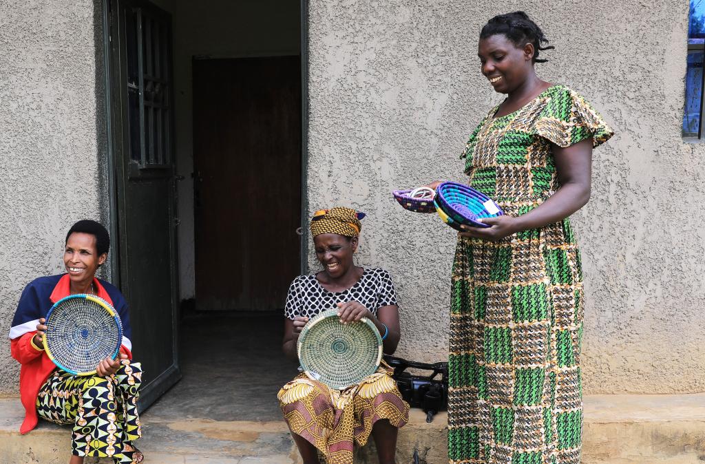 4月7日,在卢旺达东方省布格塞拉地区的姆比约团结和解村,幸存者杰奎琳与村里的妇女展示合作社编织的小装饰品。新华社记者董江辉摄