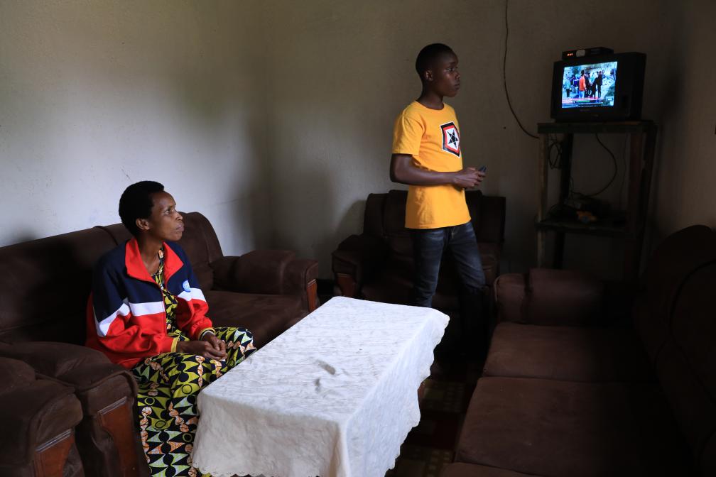 4月7日,在卢旺达东方省布格塞拉地区的姆比约团结和解村,幸存者杰奎琳与儿子在家中看电视。新华社记者董江辉摄