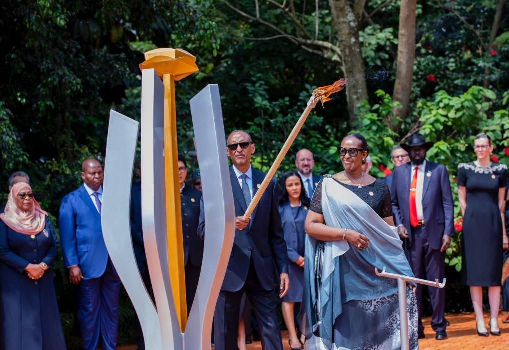 4月7日,在卢旺达首都基加利的基加利大屠杀纪念馆,卢旺达总统保罗·卡加梅与出席纪念活动的各国政要向大屠杀遇难者敬献花圈,随后共同点燃纪念火炬。