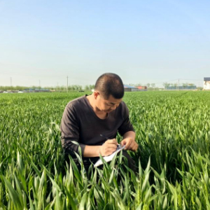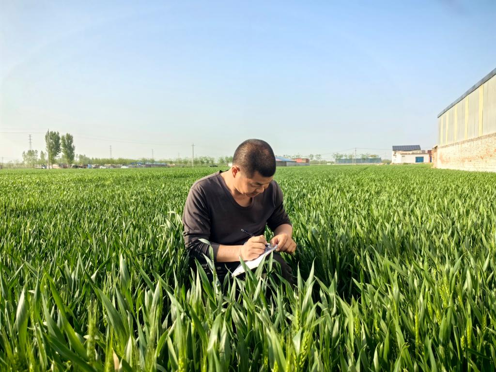 种粮大户黄树强在农田中记录小麦生长的各种信息。新华社记者 赵鸿宇 摄
