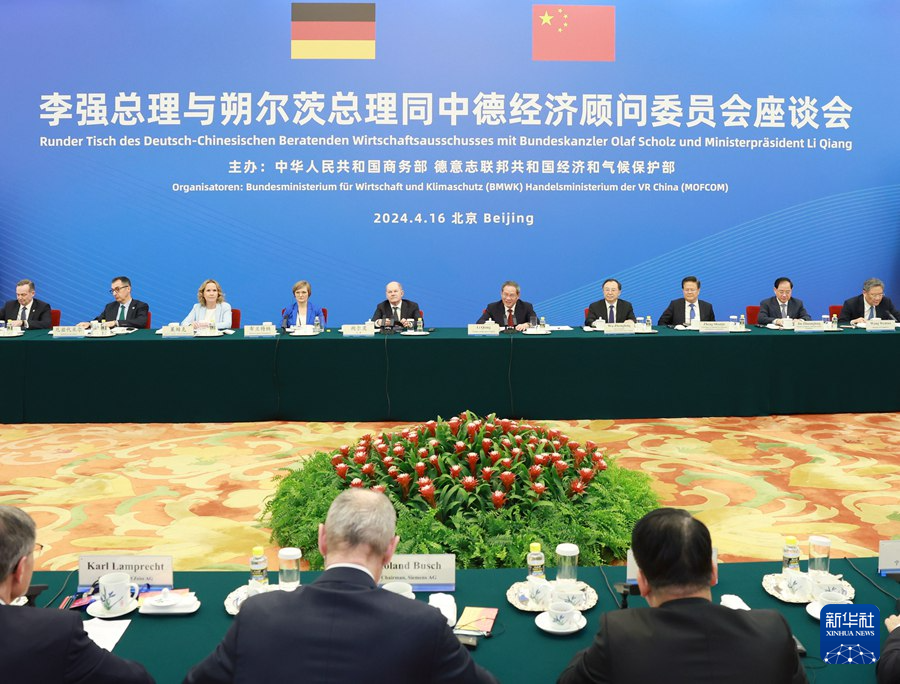 新华社北京4月16日电(记者郑明达、董雪)国务院总理李强4月16日下午在北京人民大会堂和德国总理朔尔茨共同出席中德经济顾问委员会座谈会,同与会企业家交流。中德两国20多位企业家出席。