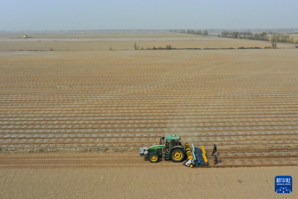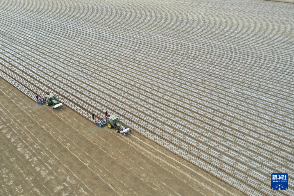 大马力拖拉机轰隆隆地驶过田野,一行行明晃晃的地膜笔直向前延伸,各种颜色的棉花种子被播进地里,一道道滴灌带跟着播种机铺设延展……
