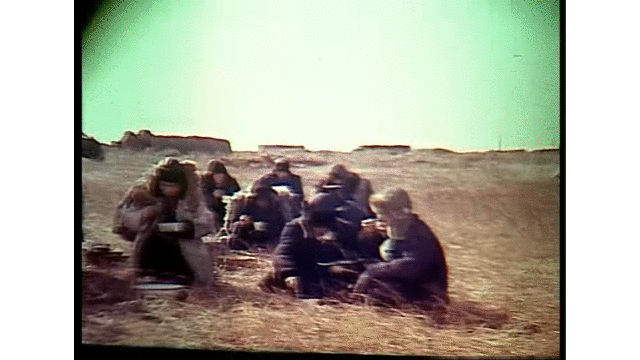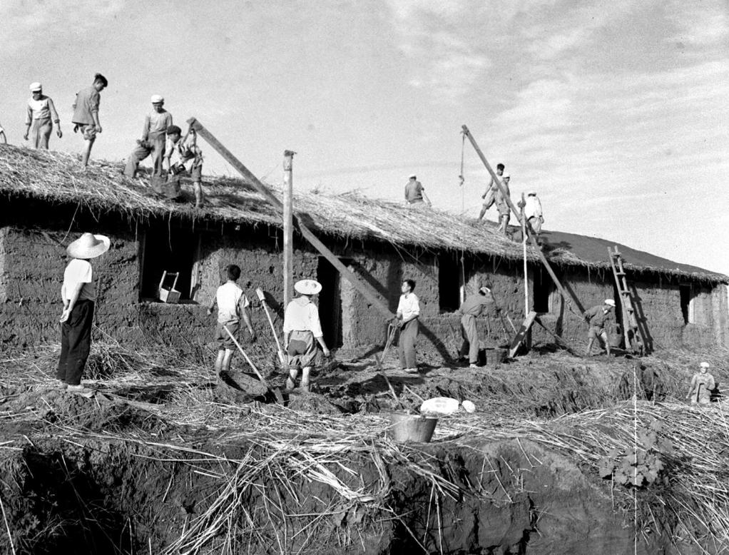 1971年,大庆石油会战的标杆队——1202钻井队工人在新油田用人抬肩扛的办法建井场。