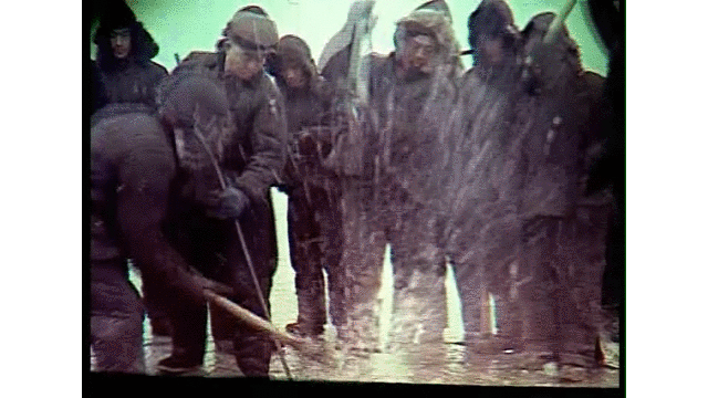 20世纪七十年代,大庆油田钻井工人在严冬里进行作业。