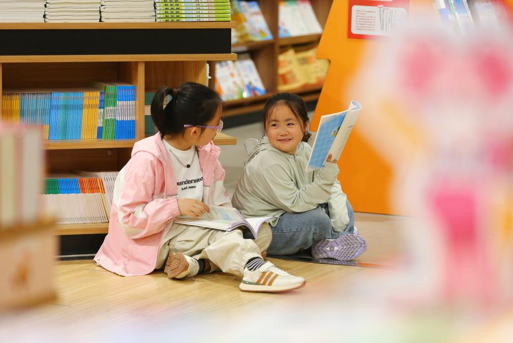 4月21日,两名小朋友在山东省滕州市新华书店内交流。新华社发(李志军摄)