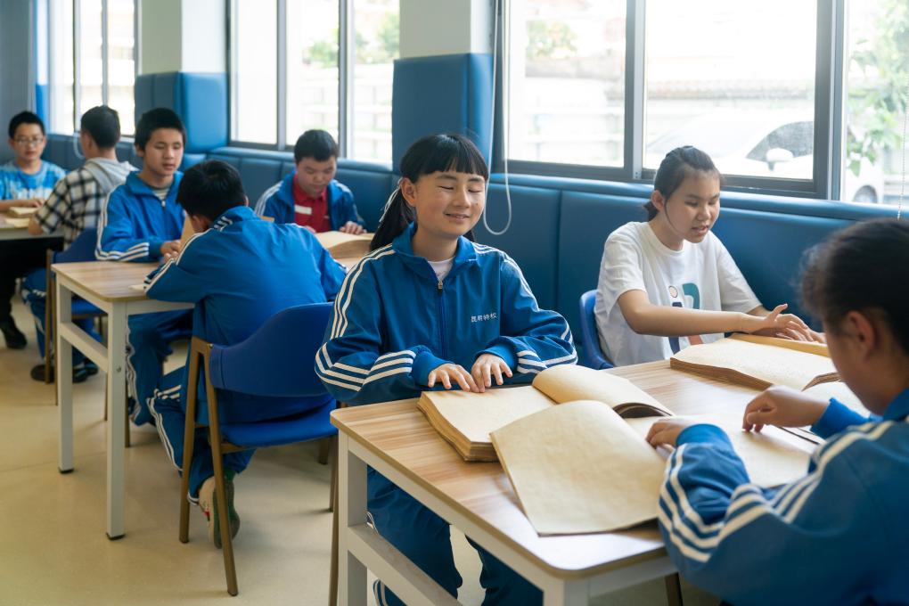 4月15日,昆明市盲哑学校的盲生们在学校图书室阅读盲文书。(新华社记者 陈欣波 摄)