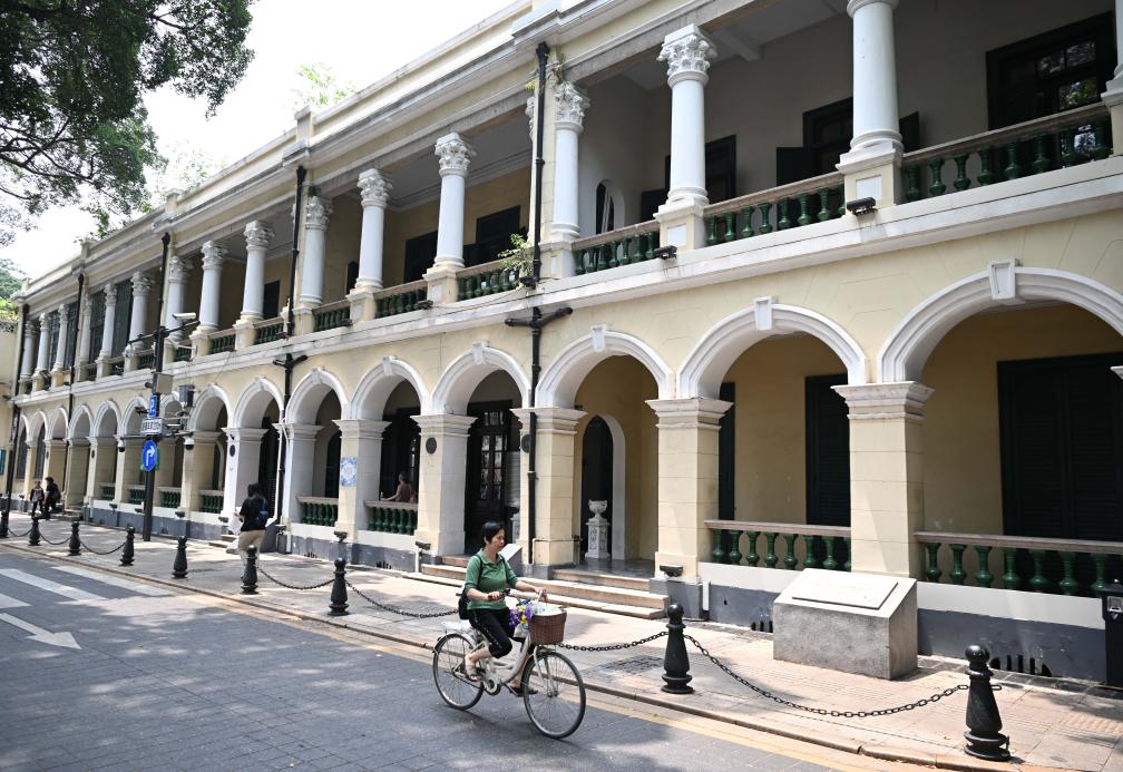 一名女子骑车经过广州沙面的欧式建筑(4月11日摄)。