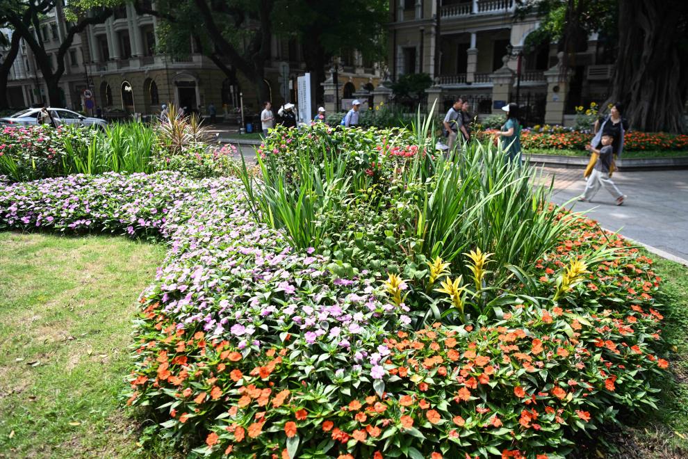 广州沙面大街上绿树成荫、鲜花盛开(4月11日摄)。