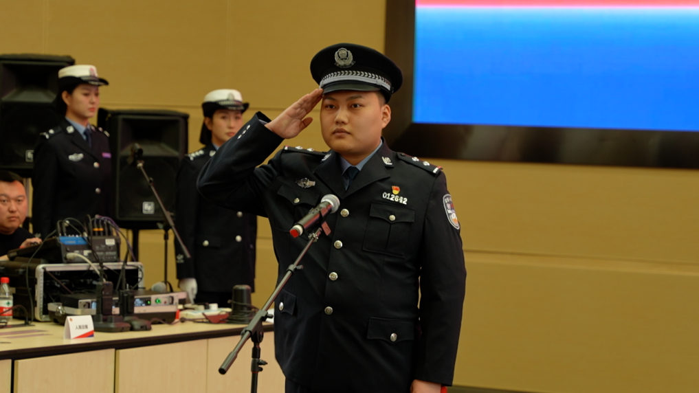 4月26日,民警包牧仁在呼和浩特市公安局荣退暨警号传承仪式上。