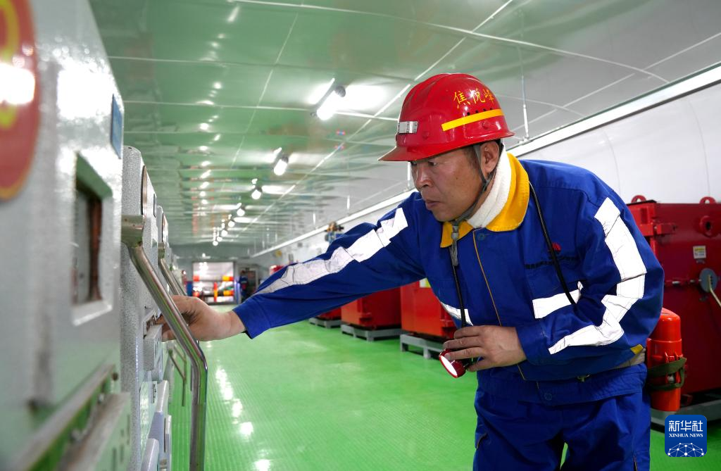 4月24日,陕煤集团神木柠条塔矿业有限公司综采维修电工焦悦峰对井下中央变电所高压开关柜进行巡查。新华社记者 吴鸿波 摄