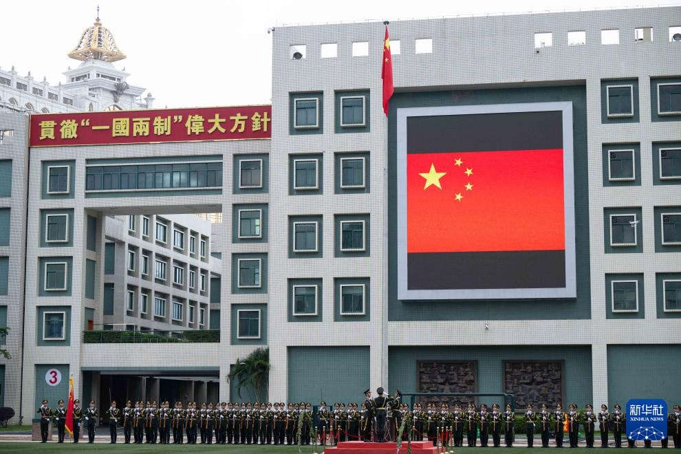 4月30日,中国人民解放军驻澳门部队官兵进行升国旗仪式。 新华社记者 张金加 摄