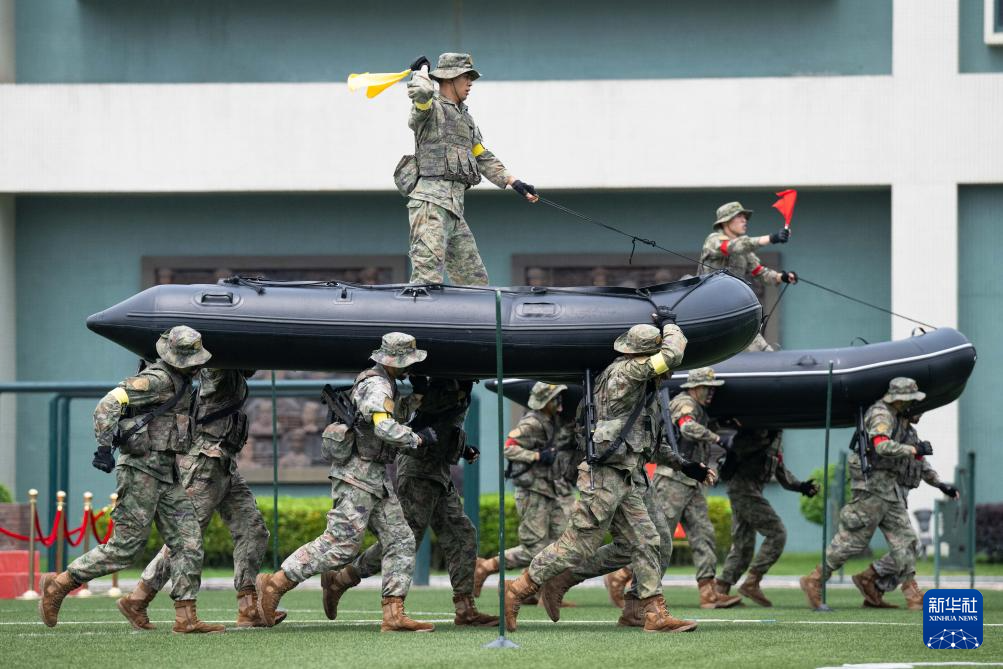 4月30日,中国人民解放军驻澳门部队官兵进行军事训练课目展示。 新华社记者 张金加 摄