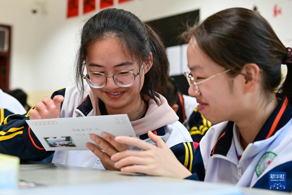 在新疆双河市高级中学,学生收到“山水知行”书信陪伴计划的回信(4月12日摄)。新华社记者 丁磊 摄