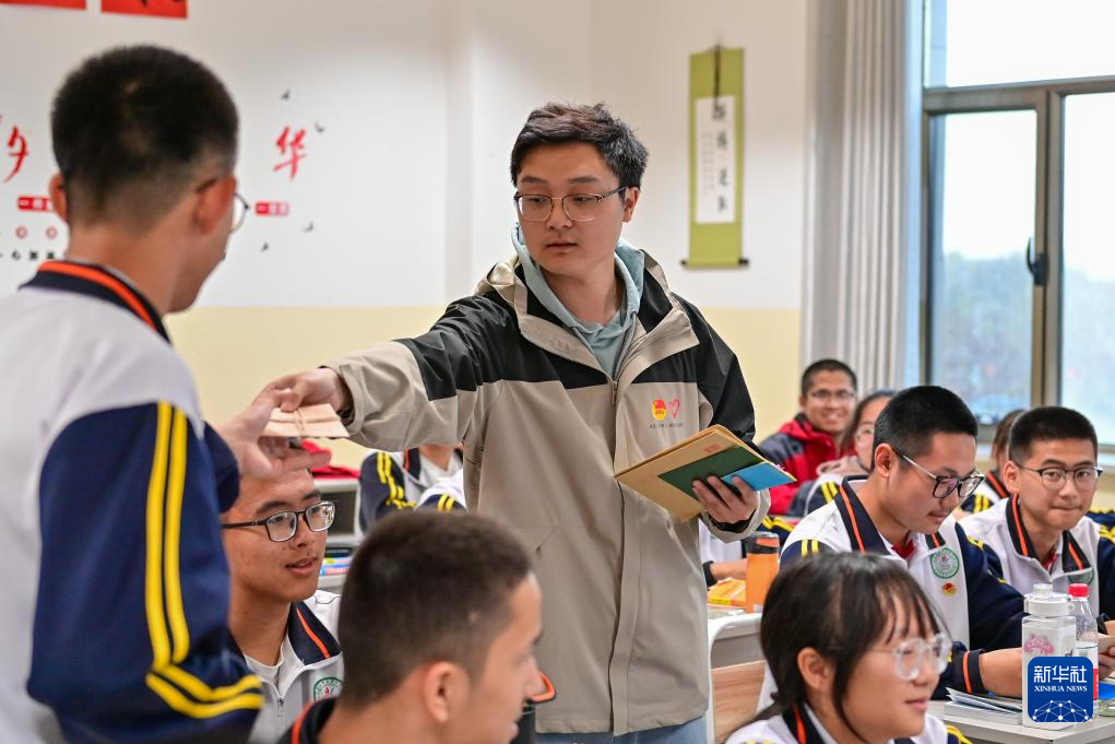 在新疆双河市高级中学,第25届支教团成员王仡柯为同学分发回信(4月12日摄)。新华社记者 丁磊 摄