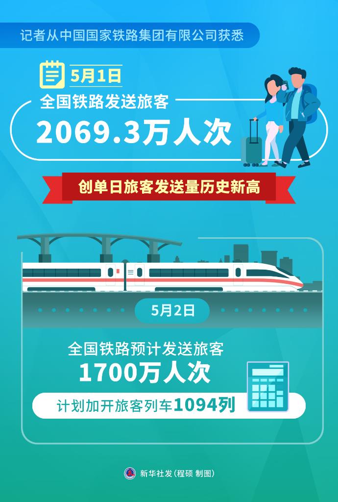 新华社北京5月2日电(记者樊曦)记者从中国国家铁路集团有限公司获悉,5月1日,全国铁路发送旅客2069.3万人次,创单日旅客发送量历史新高。5月2日,全国铁路预计发送旅客1700万人次,计划加开旅客列车1094列。