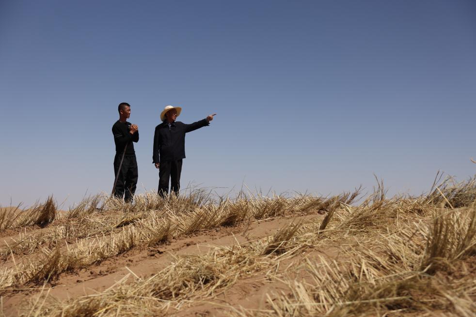 4月10日,在古浪县八步沙林场麻黄塘沙区,郭玺(左)和郭万刚在交流。新华社记者 方欣 摄