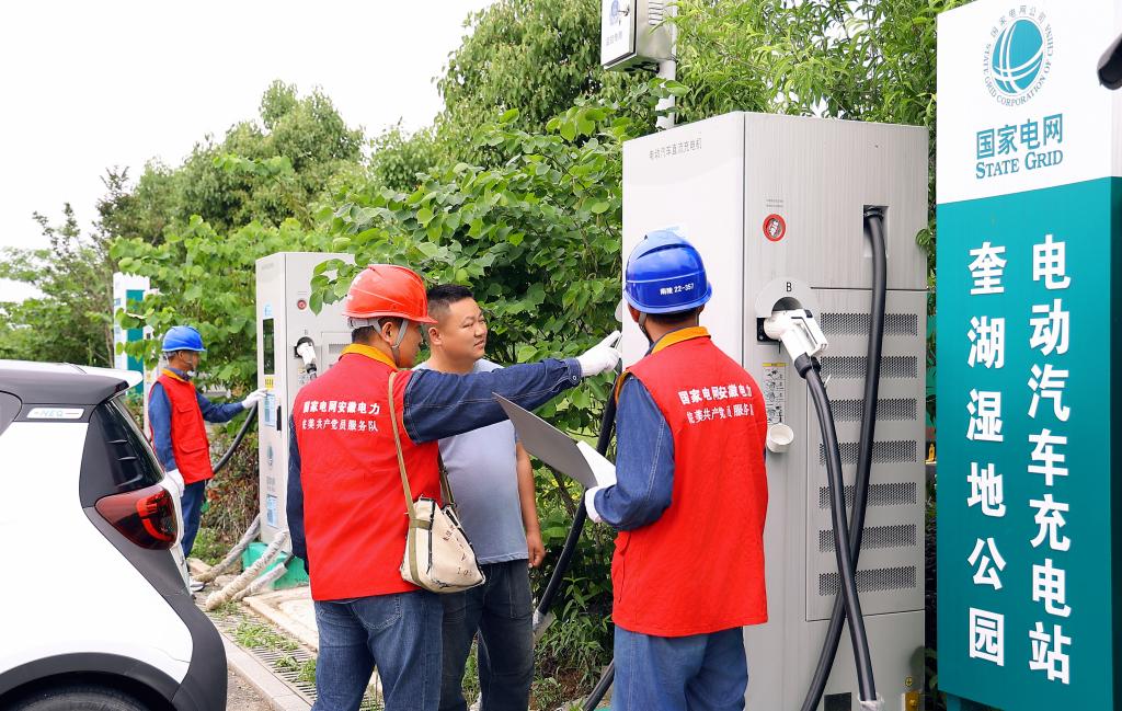 新华社合肥5月5日电(记者吴慧珺、贾稀荃)近日,在新投运的安徽南陵奎湖省级湿地公园电动汽车充电站,国网南陵县供电公司营销部主任叶良带领团队,一边与前来充电的电动汽车主沟通填写充电体验问卷,一边核对着现场设备和环境信息,为充电站扩建方案收集最新资料。