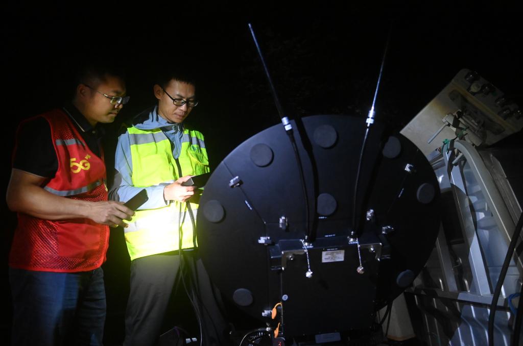 7日凌晨,在广西岑溪市波塘镇六肥村,工作人员在调试应急通信设备。新华社记者陆波岸摄