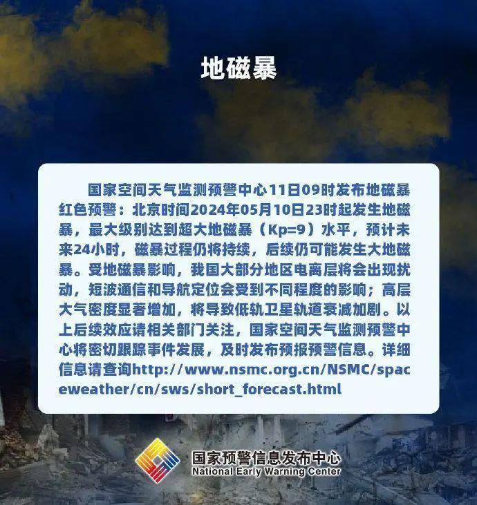 国家空间天气监测预警中心11日9时发布地磁暴红色预警:北京时间2024年5月10日23时起发生地磁暴,最大级别达到超大地磁暴(Kp=9)水平,预计未来24小时,磁暴过程仍将持续,后续仍可能发生大地磁暴。