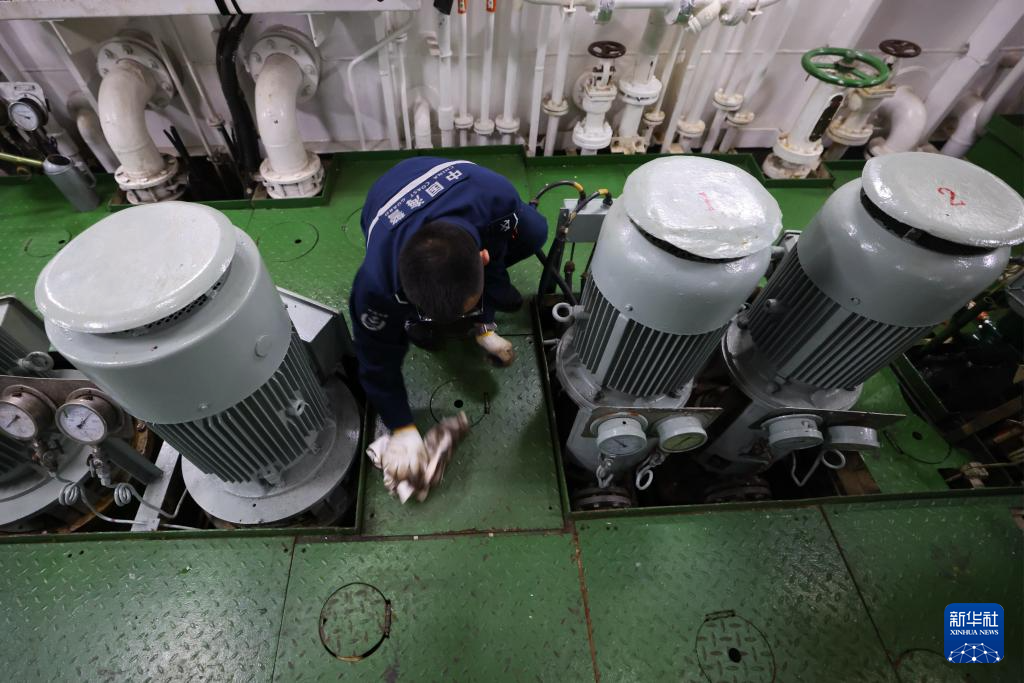 4月10日,俞帅帅在海警川山舰上检修设备。新华社记者 邢广利 摄