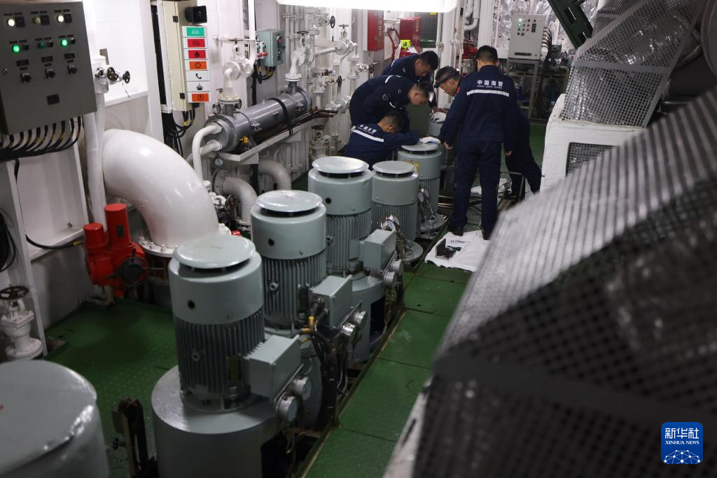 4月10日,执法员在海警川山舰机舱中检修设备。新华社记者 邢广利 摄