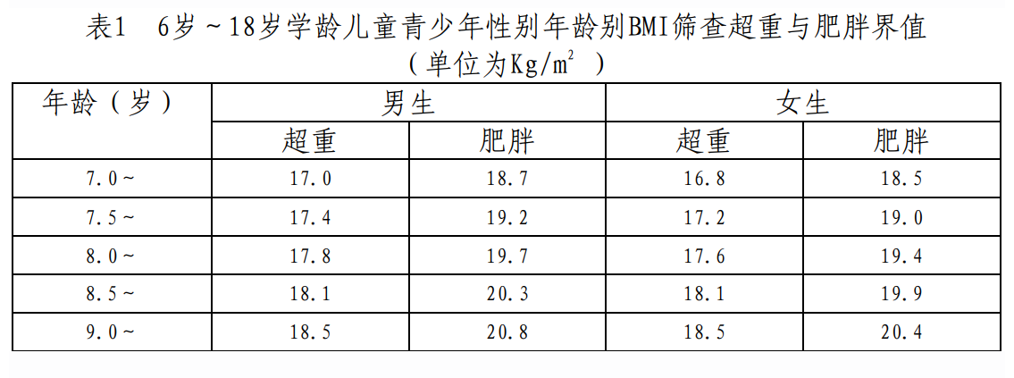 1.测量身高和体重:身高和体重是判断儿童是否肥胖的基础指标。通过计算BMI(体重指数),即用体重(kg)除以身高(m)的平方,再根据表1中儿童对应的年龄组和性别的界值,我们就可以判断儿童的肥胖状况。比如,一个7岁的女孩,身高125cm,体重30kg,她的BMI就是19.2,超过了7岁女孩的BMI界值18.5,那么她就被界定为肥胖。