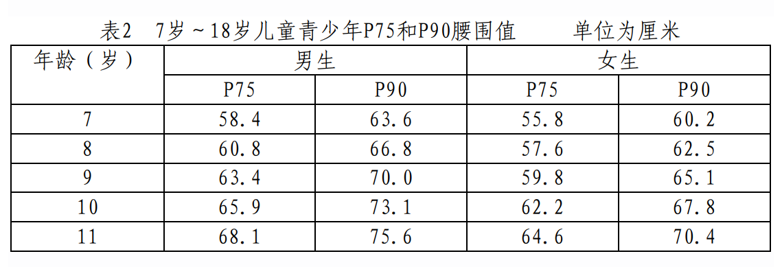 2.量腰围:腰围可以反映儿童腰腹部的脂肪囤积状况,也可以用来评估儿童是否有中心性肥胖。对于7岁及以上的儿童青少年,可以根据表2中的标准来判断。当儿童腰围大于等于表中相应年龄和性别的P90腰围值时,就被认为是高腰围,可能存在中心性肥胖。