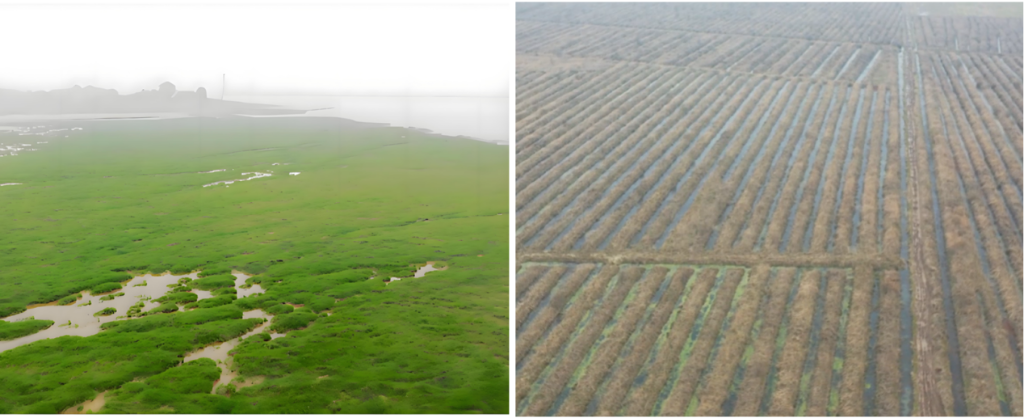 拼版照片:左图为南洞庭湖自然湿地景观(资料图片),右图为南洞庭湖挖沟抬垄现状。(督察组供图)