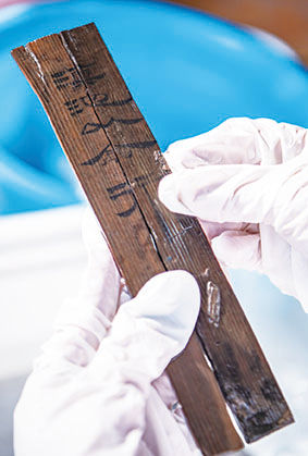 考古工作者在清理河泊所遗址出土的简牍(资料图)。新华社记者江文耀摄