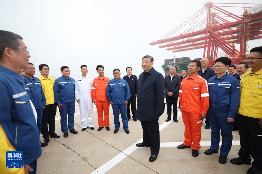 5月22日至24日,中共中央总书记、国家主席、中央军委主席习近平在山东考察。这是22日下午,习近平在日照港亲切慰问港口科技工作者、运营人员、航运人员。 新华社记者 谢环驰 摄