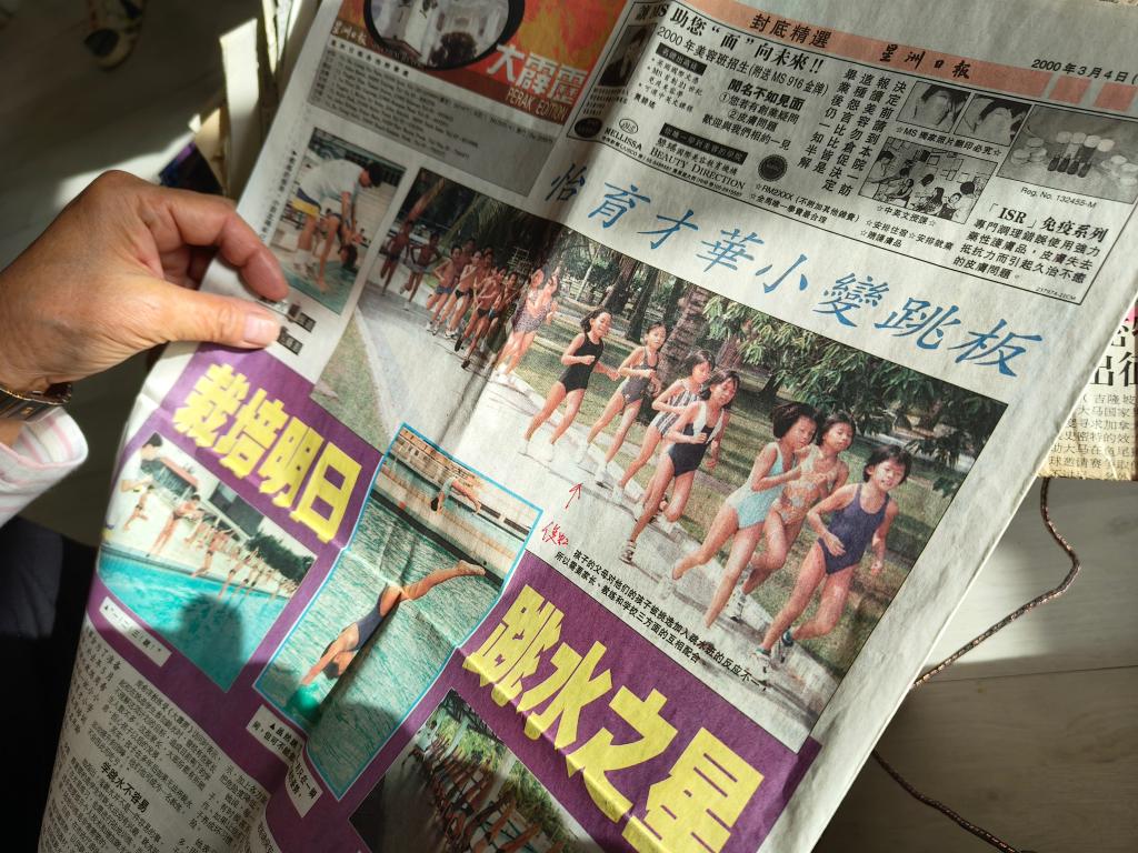 当地华文报纸报道周希洋《栽培明日跳水之星》,图中箭头所指的就是张俊虹和队友们进行跑步训练