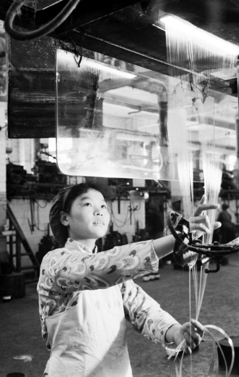 1961年,上海耀华玻璃厂工人在玻璃纤维拉丝车间作业。