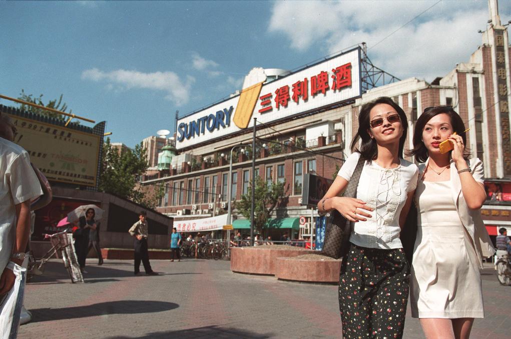 1998年,两名女子在上海一处商业街逛街购物。