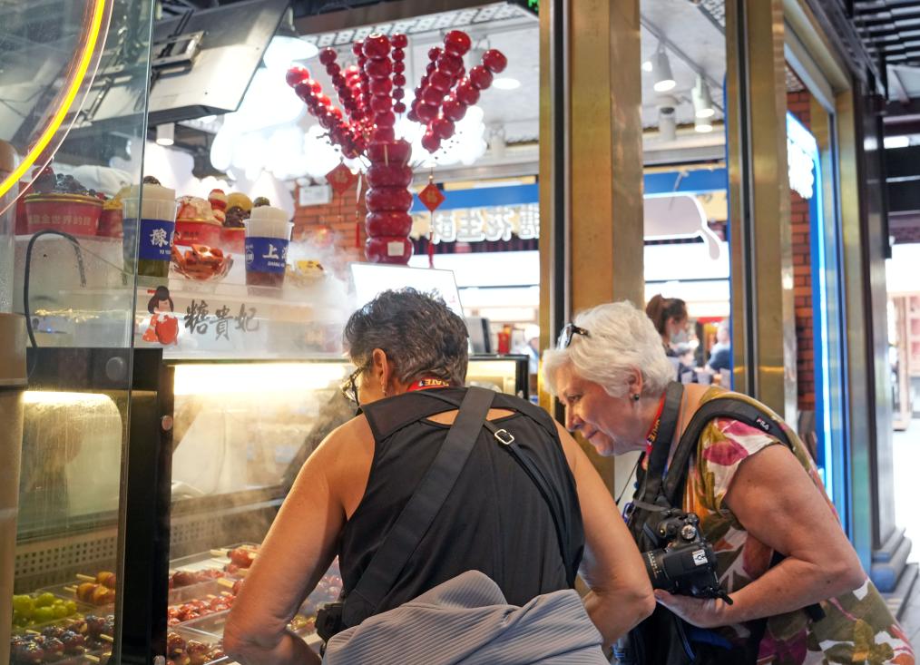 2024年5月21日,外国游客在上海豫园商城被冰糖葫芦吸引。