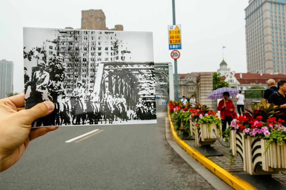 1949年5月25日解放军行进在外白渡桥上的历史照片与现实的拼接(2016年5月24日摄)。