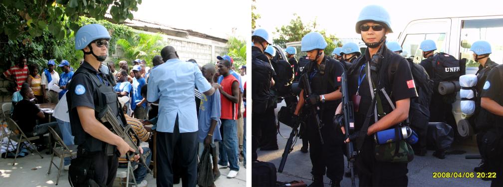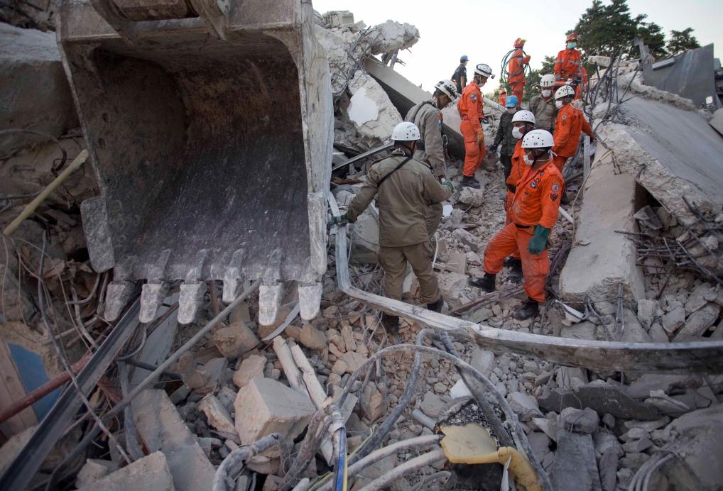 2010年1月15日,来自各国的救援队员在联合国海地稳定特派团总部大楼废墟上实施救援。新华社记者 戴维 摄