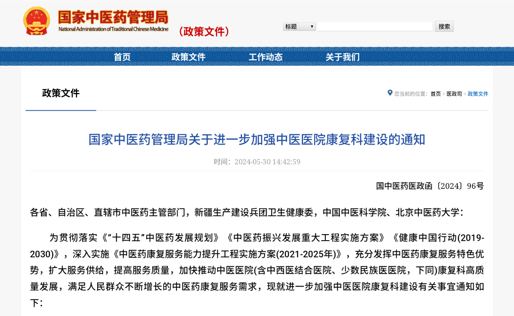 同时,通知提出,中医医院要结合院内发展重点和优势专科,探索中西医紧密协作的康复服务模式,将中医康复纳入院内会诊、多学科诊疗等管理制度,将康复理念贯穿于医疗服务各环节。促进中药、针灸、推拿等中医康复技术方法和现代康复技术、中华传统体育的相互融合,找准针灸、推拿等手段的切入点和介入时机,积极探索早期介入,为患者制定实施全流程、个性化的康复方案。