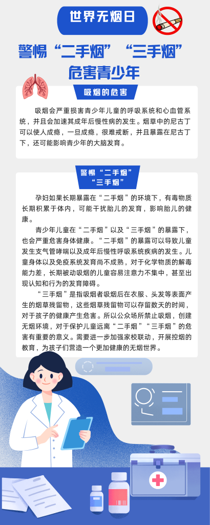 今年5月31日是第37个世界无烟日,主题是“保护青少年免受烟草危害”。专家呼吁,警惕“二手烟”“三手烟”问题危害青少年儿童健康,公共场所禁止吸烟、创建无烟环境,对保护儿童远离“二手烟”“三手烟”危害有重要意义,需要进一步加强家校联动,加强控烟宣传和教育,为孩子营造一个更健康的无烟环境。