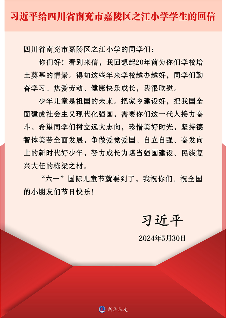 新华社北京5月31日电 在“六一”国际儿童节即将到来之际,中共中央总书记、国家主席、中央军委主席习近平5月30日给四川省南充市嘉陵区之江小学的学生们回信,对他们予以亲切勉励,并祝他们和全国的少年儿童节日快乐。