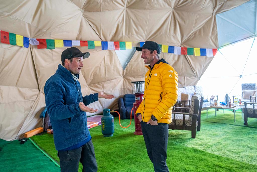 在珠峰登山大本营,卢卡斯·富滕巴赫(右)正在和队友哈康·埃兰森聊天交流(5月24日摄)。新华社记者 孙非 摄