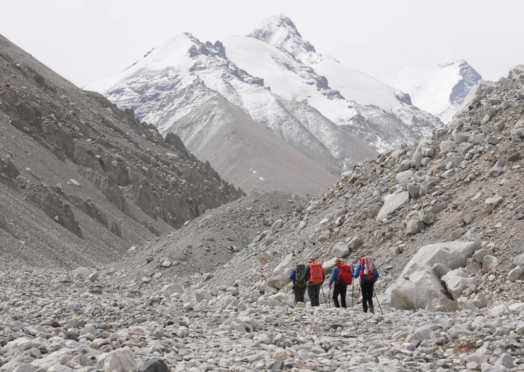 德诺埃尔兄弟和队友们正在离开珠峰登山大本营前往更高海拔的营地(5月18日摄)。新华社记者 丁汀 摄