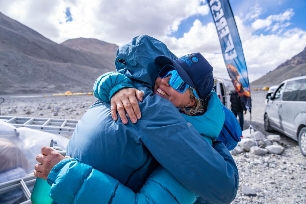 西芙·哈尔斯塔跟自己的高山向导拥抱(5月24日摄)。新华社记者 孙非 摄