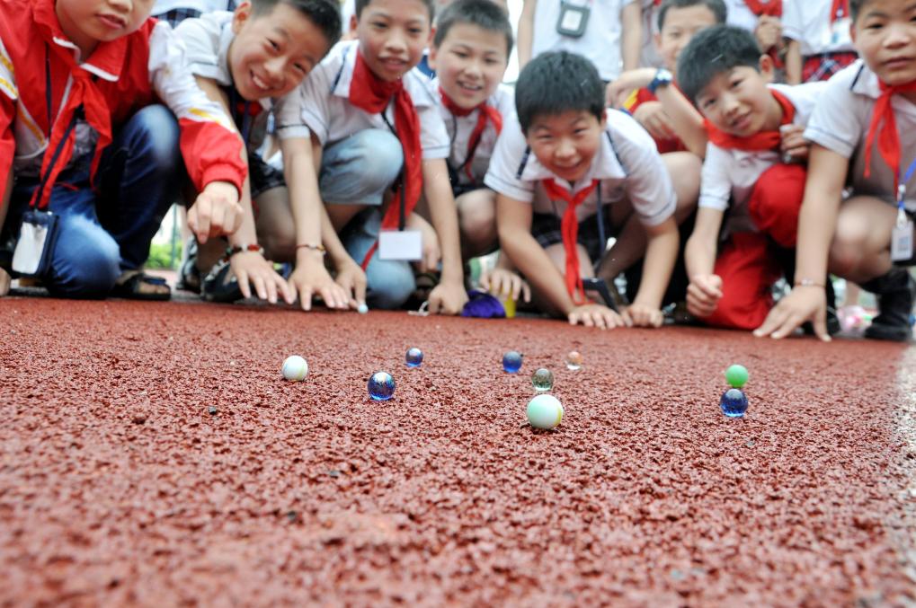2015年5月27日,在江西省万载县第一小学,孩子们在“寻找父母儿时的老游戏”迎“六一”活动中玩打弹珠。