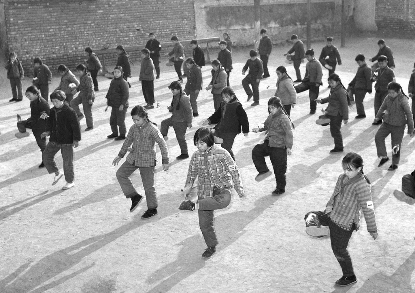 1956年12月,河北省高阳县邢果庄村的小学生们在空地上跳绳。