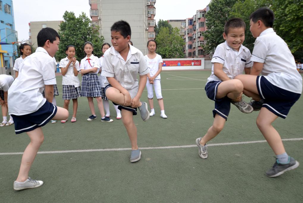 2014年5月28日,河北省邯郸市渚河路小学的学生在玩“斗驹”。