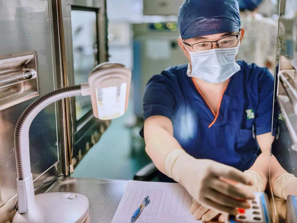 2023年12月,上海市第一妇婴保健院生殖医学中心胚胎实验室的工作人员在取卵手术中检查记录卵泡液。上海市第一妇婴保健院供图