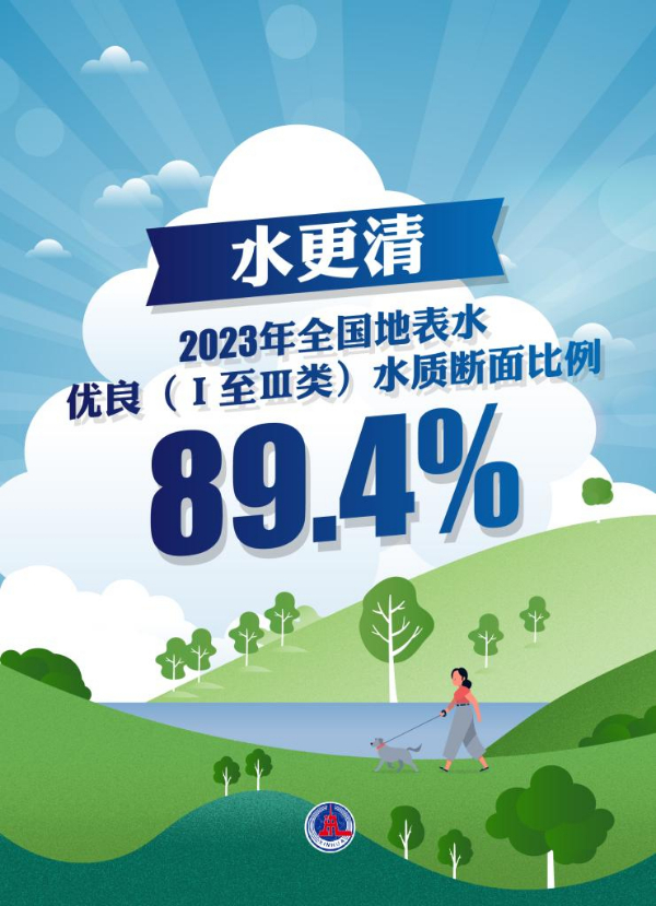 水更清——全国地表水优良(Ⅰ至Ⅲ类)水质断面比例为89.4%;