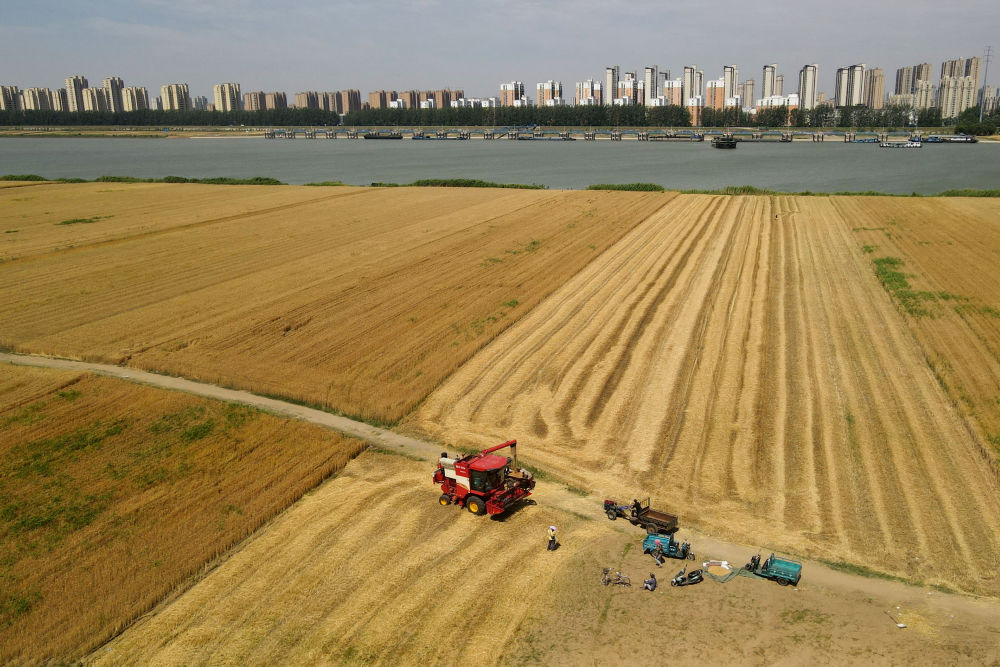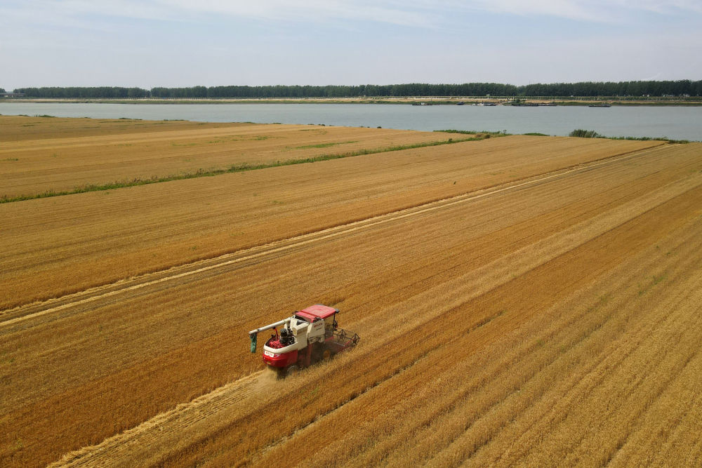 5月29日,在蚌埠市五河县朱顶镇淮河岸边,农机手驾驶收割机收割小麦。 新华社记者 黄博涵 摄