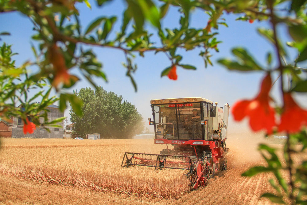 5月23日,收割机在河南省南阳市社旗县陌陂镇收割小麦。 新华社发(杨银鹏摄)