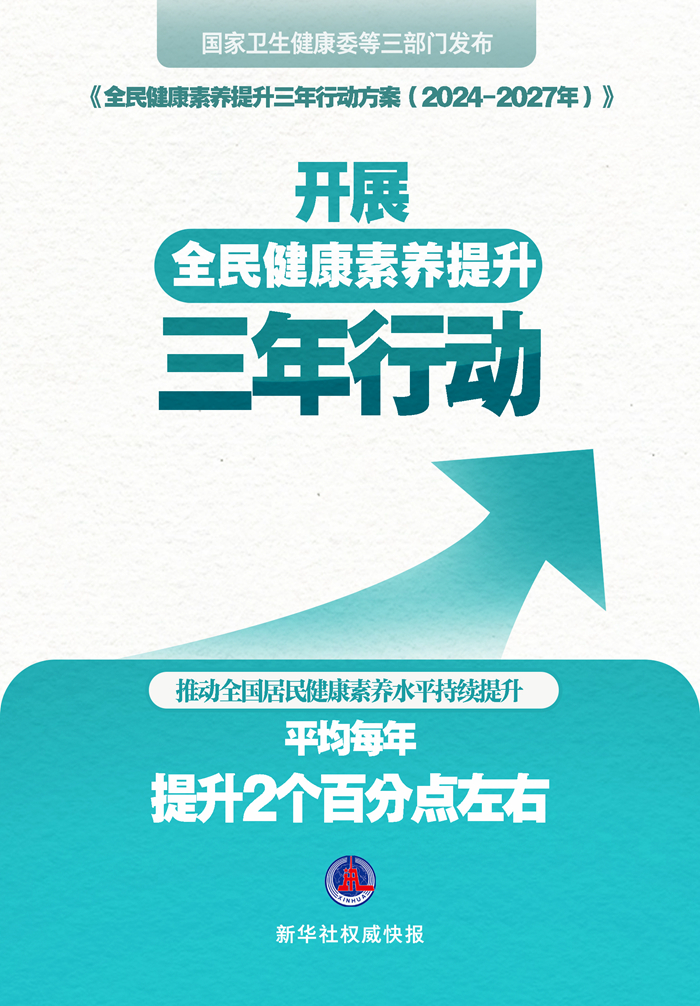 新华社北京6月6日电(记者李恒、董瑞丰)健康教育人才队伍更加壮大;全国居民健康素养水平持续提升,平均每年提升2个百分点左右……国家卫生健康委、国家中医药局、国家疾控局日前联合印发《全民健康素养提升三年行动方案(2024-2027年)》,提出上述主要目标。